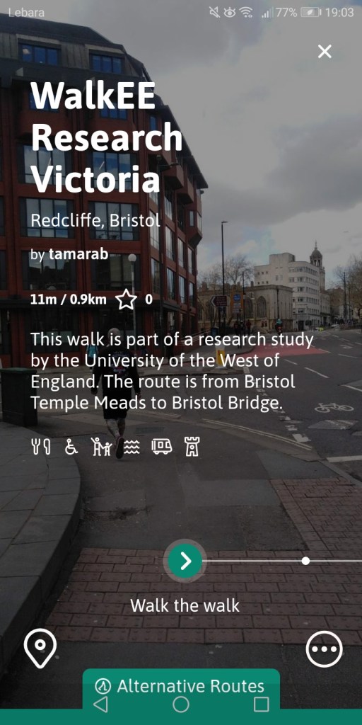 Participants are invited to walk two walks, both from the Temple Meads station to Bristol Bridge. The walks are guided by the free Go Jauntly app, including a few questions about the walking experience, before, during, and after the walk. A paper-based version will also be available in the next days, more info will be added here.