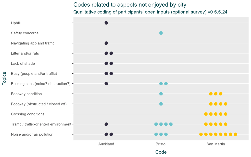 The optional survey invited participants to provide insights on (a) the difficulties they might have experienced along the walk; (b) the aspects they enjoyed; and (c) the aspects they did not enjoy. Open text entries were coded qualitatively to identify the topics, i.e. features referred to. The coding was done separately by three researchers, for the inputs for Auckland and Bristol (in English). The comparison of the results showed a good level of agreement with minor differences relative to the level of granularity (e.g. “walking environment” instead of “crossing facilities”). After agreement on the codes and the level of detail, the coding for San Martin (in Spanish) was done by CG and LV and reviewed by TB. The codes obtained were grouped into categories where relevant, so to aggregate similar concepts, especially for codes mentioned only by one participant. The categorisation was not forced – for instance, one person enjoyed seeing a landmark, and this input was kept as a category on its own because it was conceptually distinct from other codes. The results from the 32 inputs to the optional survey are presented below (each input corresponds to one walk; the number of unique respondents is not known because the survey was anonymous).
