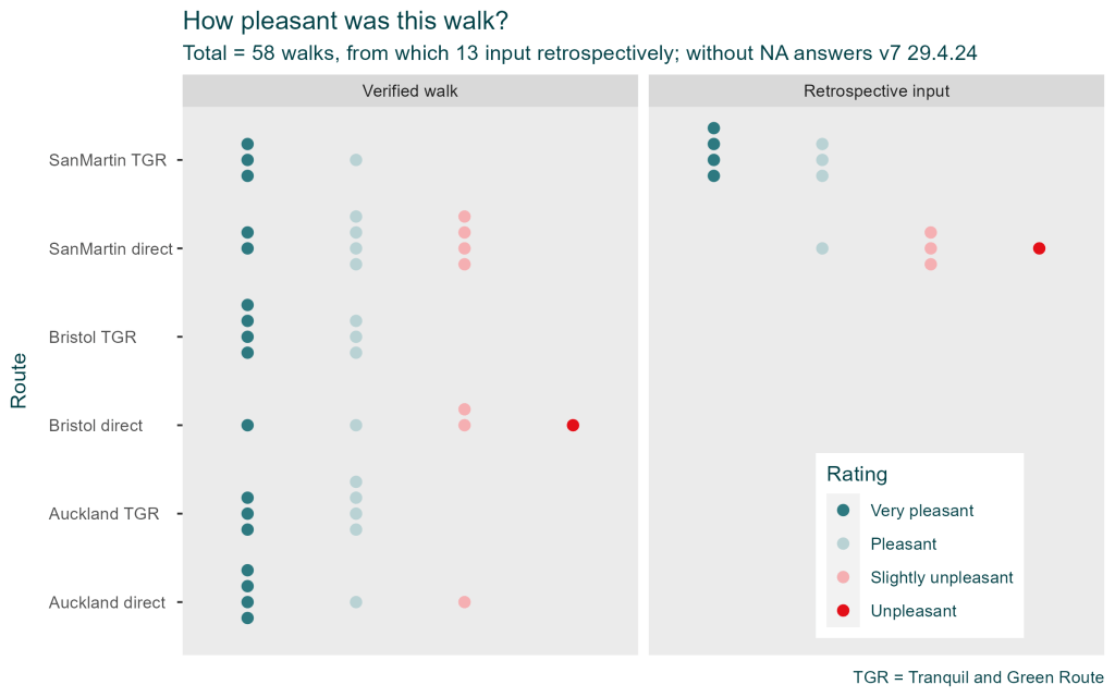 Participants were asked to rate the pleasantness of the walk as well as the perceived safety regarding traffic, and personal safety. Regarding pleasantness , 39 of the 51 rated walks were perceived as pleasant or very pleasant, with 12 being seen as slightly or very unpleasant. None of the tranquil and green routes was rated as unpleasant.