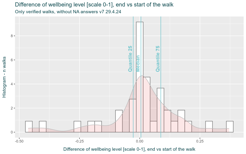 The level of wellbeing was asked at the start and at the end of each walk (slider input recorded as a continuous variable between 0 and 1). The difference was calculated for each walk and is presented below. The distribution is centred on zero, suggesting no significant changes in wellbeing, and most values are between -0.15 and +0.15). There appears to be no notable difference in change in wellbeing, comparing between the direct and tranquil and green routes across the cities). The comparison of changes in wellbeing between the two routes, for single participants, was not calculated, in reason of the low number of participants who walked both routes.